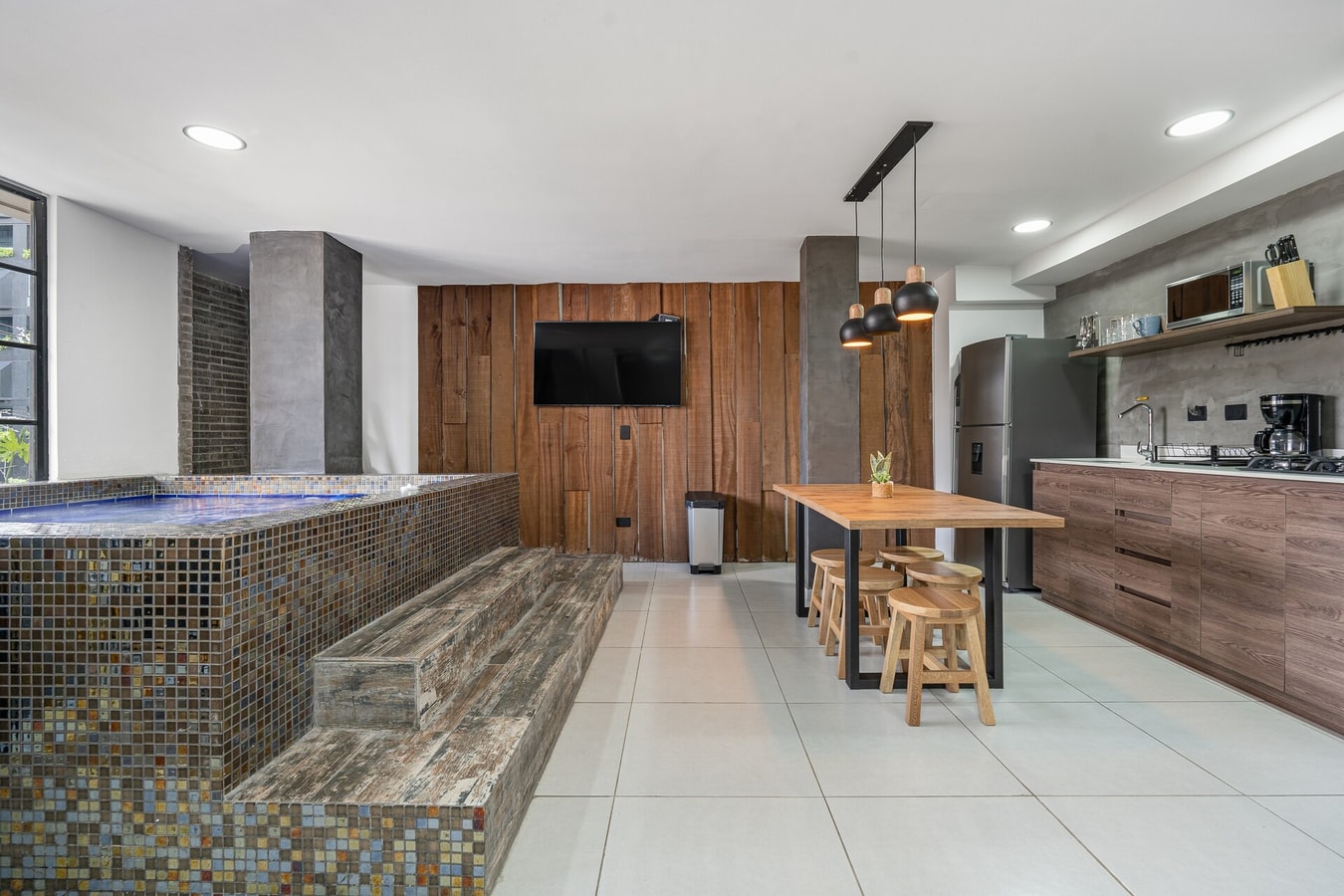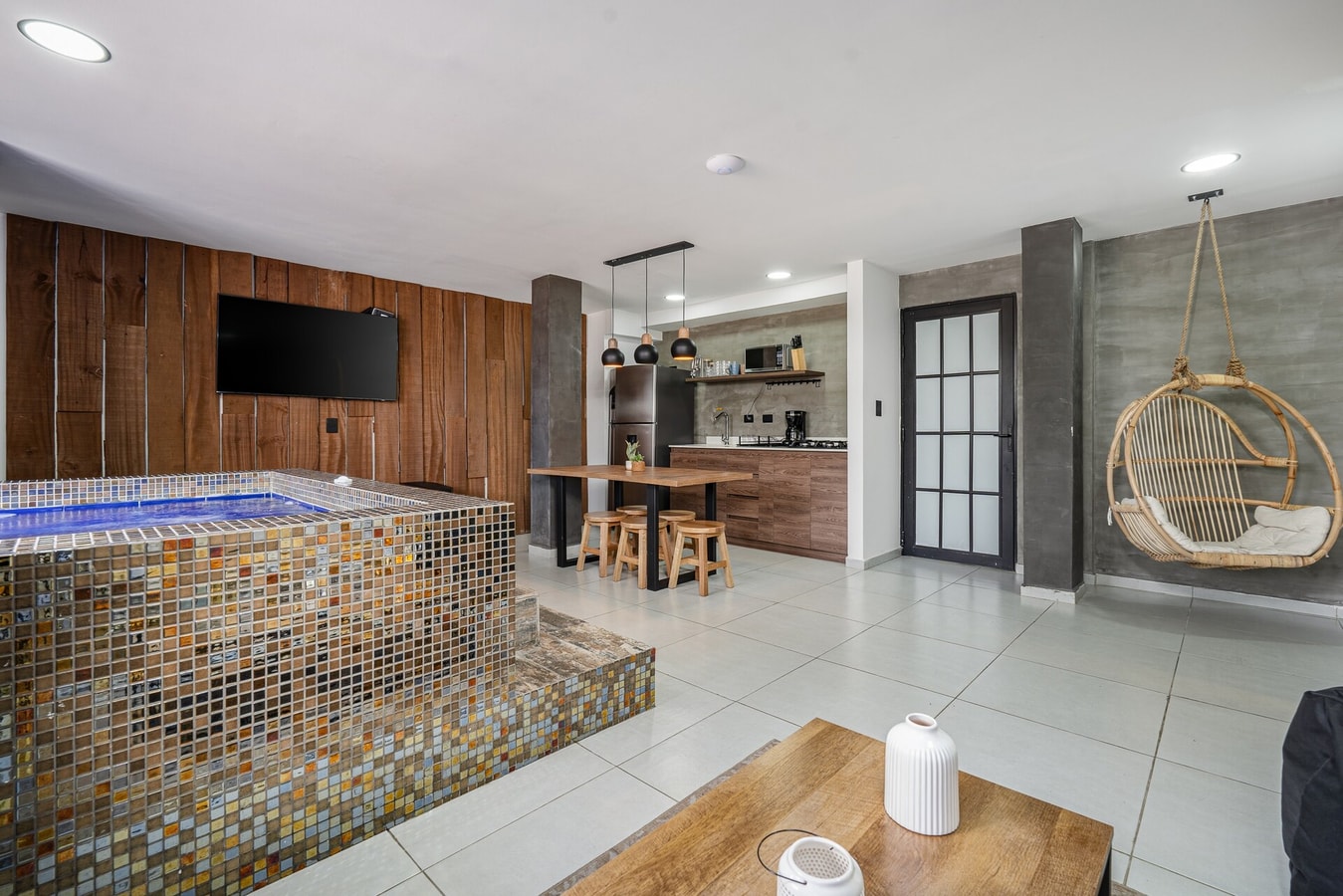 The penthouse boasts a spacious living and dining area, decorated in a modern and welcoming style. Each bedroom also features AC, ensuring that your stay is as comfortable as possible. But the real gem of this space is the giant Jacuzzi, ideal for unwinding after a day of exploring the city.